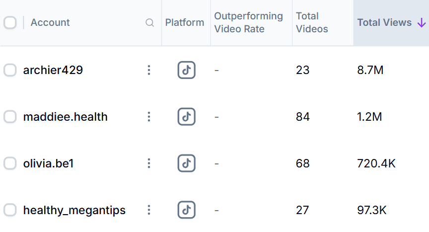One account, @archier429, stands out with 8.7M views across just 23 videos.