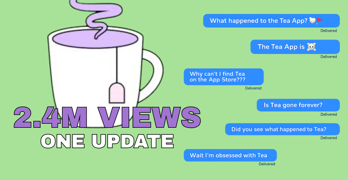 In the last month, Tea pulled 7.2M views across 20 creator accounts, with their biggest spike coming from a Tea 2.0 announcement that hit 2.4M views (“the newest version of Tea is almost here”).