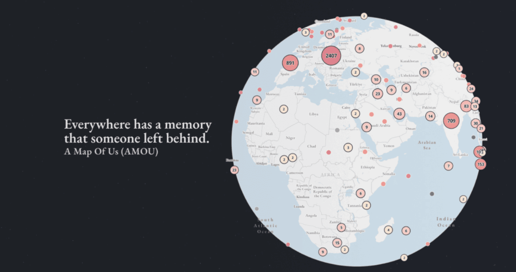 A Map of Us (amapof.us) is a location-based storytelling platform where users anonymously pin memories and meaningful dates to specific coordinates around the world.