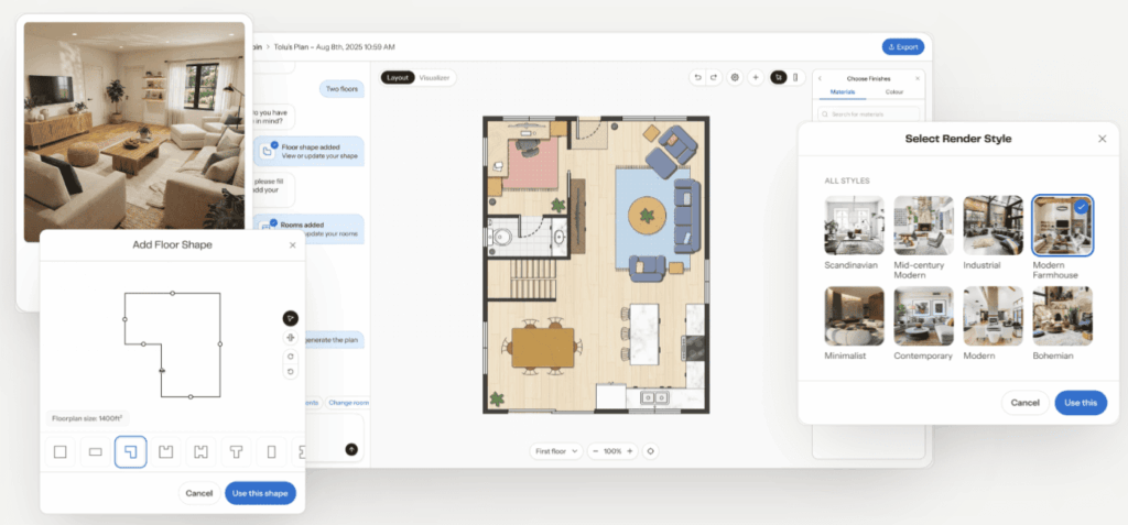 The platform helps homeowners, builders, and real estate professionals generate residential floor plans, test different layouts, and visualize homes with AI inside one workspace.