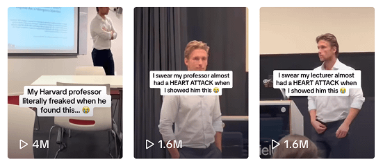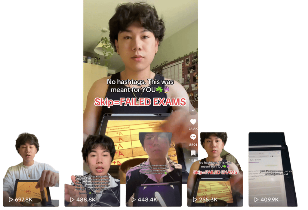 One creator (the only white guy in their creator mix) pulled 1.5 million views with a different hook: an “exam ritual” promising that you can skip studying and still score high grades. That video was reposted across at least 4 accounts and has pulled over 30 million views in total.