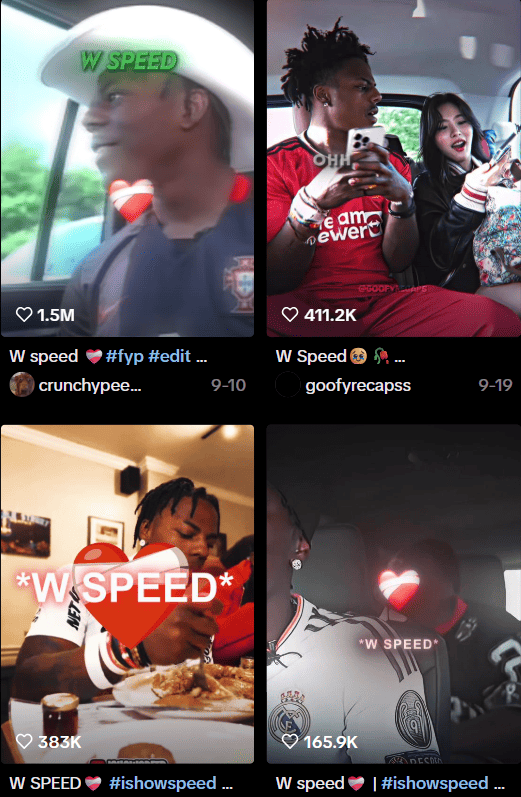 The hook is literally “W Speed” (“W” = win), often paired with soft, emotional music.