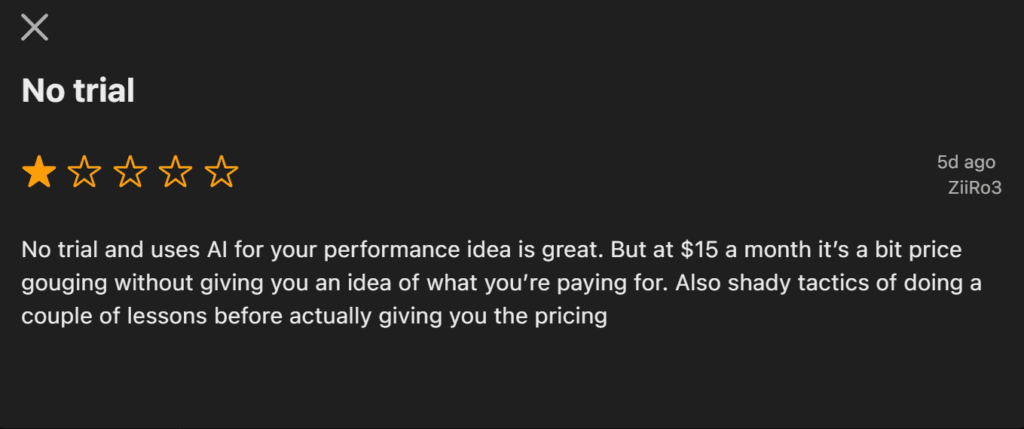 Users try a few lessons, then hit a paywall. It charges $14.99 per month or $99.99 per year.
