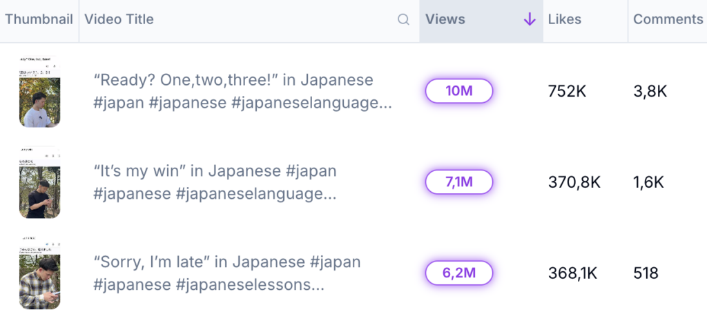 In 2024, the creator had a different format, but it also led to strong engagement: videos where he says the same phrases in Japanese, with eye-catching captions in both English and Japanese.