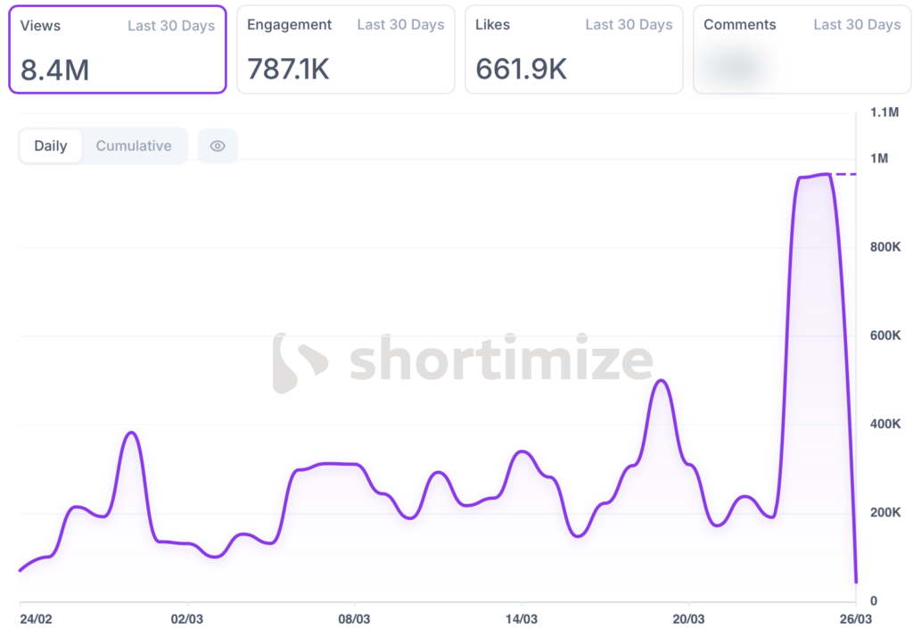 Over the last 30 days, the network pulled 8.4M views across 60 accounts, and a big part of that comes from this same structure being reused again and again.