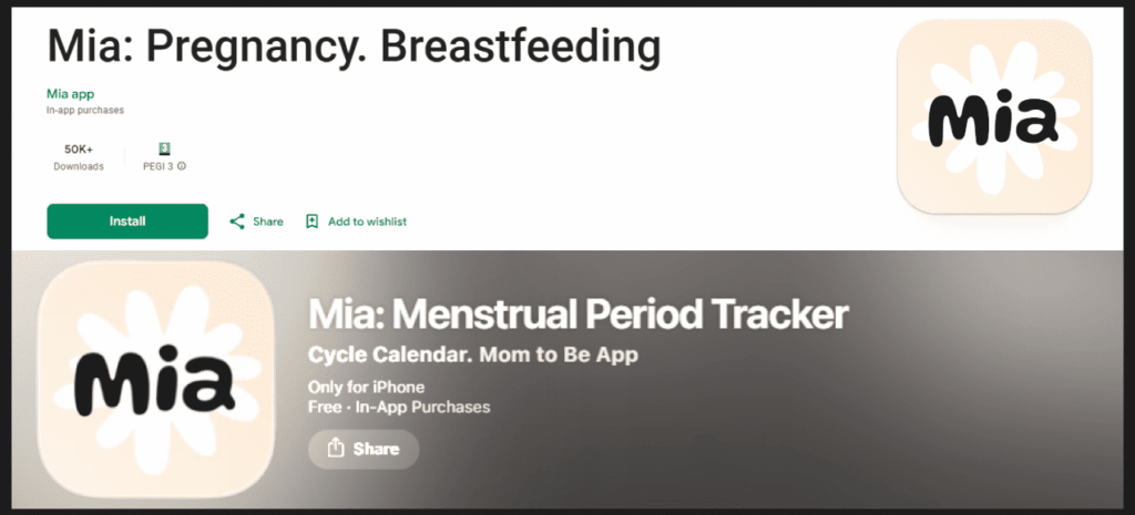 The naming reflects that change: Android still shows “Mia: Pregnancy. Breastfeeding,” while the App Store lists “Mia: Menstrual Period Tracker.”