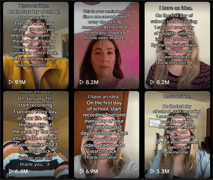“Happy new year. here’s an idea starting tomorrow. Take a one second video everyday starting January 1st, and at the end of the year, you’ll have a 6 minute video of your whole year. I did it in 2020.” -> 15M views & 327K saves.