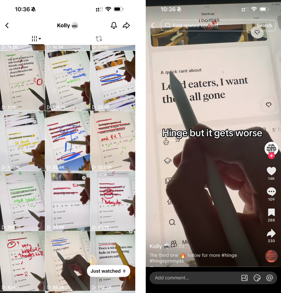 Another example is a creator making videos about commenting on Hinge prompts. The execution is excellent and I have not seen many others doing it yet. It is easy to repeat and clone, and several “rizz” style apps could easily be built around that format.