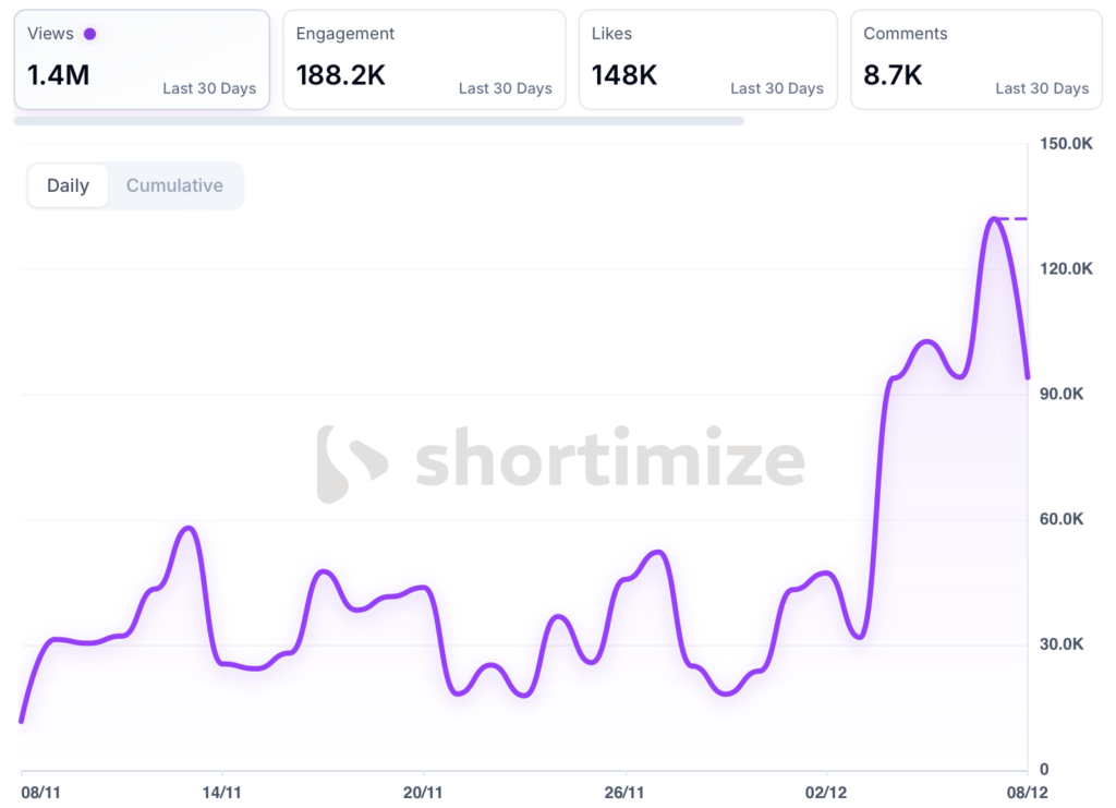 And in the past 30 days, their numbers spiked again: 1.4M views almost entirely from one format.