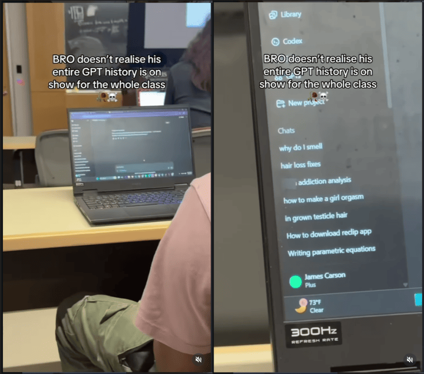 “BRO doesn’t realize his entire GPT history is on show for the whole class“.