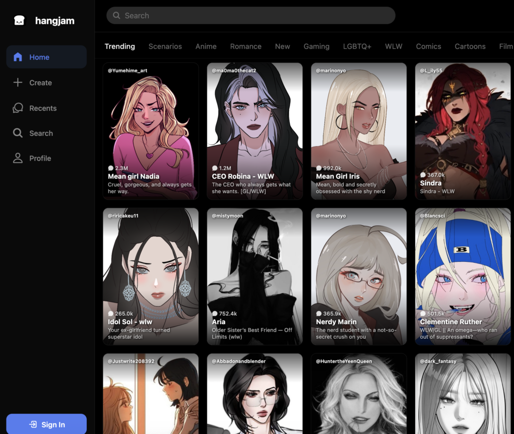 Most of the content is soft erotica: it only implies what’s happening, teases the situation, and then pushes viewers to talk with the character on Hangjam at the end.