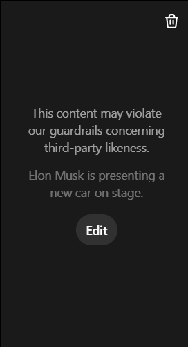 For example, if you include “Elon Musk” in your prompt, it won’t generate anything at all. His name triggers the algorithm, and this will happen: