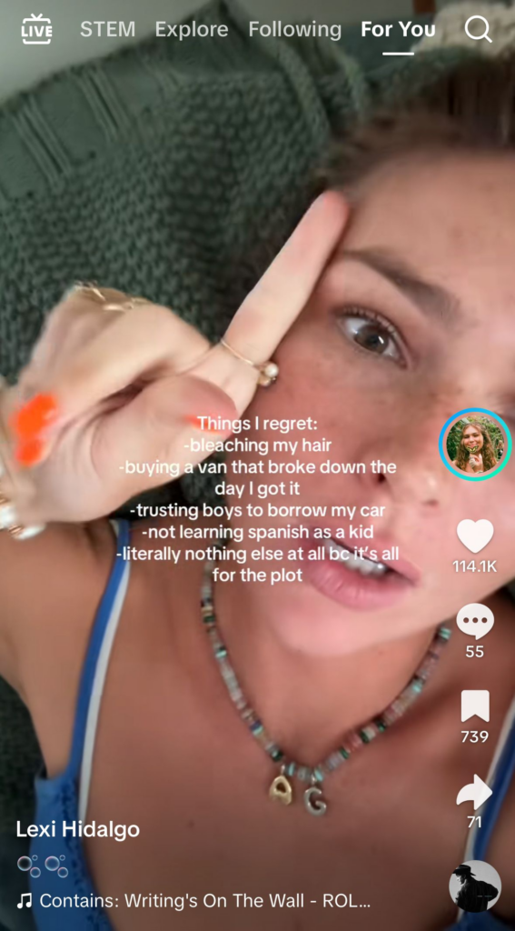 “Things I regret: bleaching my hair, buying a van that broke down the day I got it, trusting boys to borrow my car, not learning Spanish as a kid, literally nothing else because it’s all for the plot”.