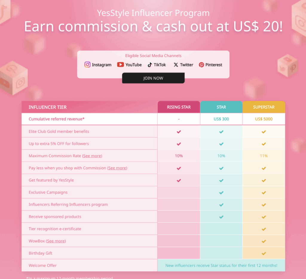 YesStyle’s referral system has 3 tiers built to turn small creators into steady traffic drivers.